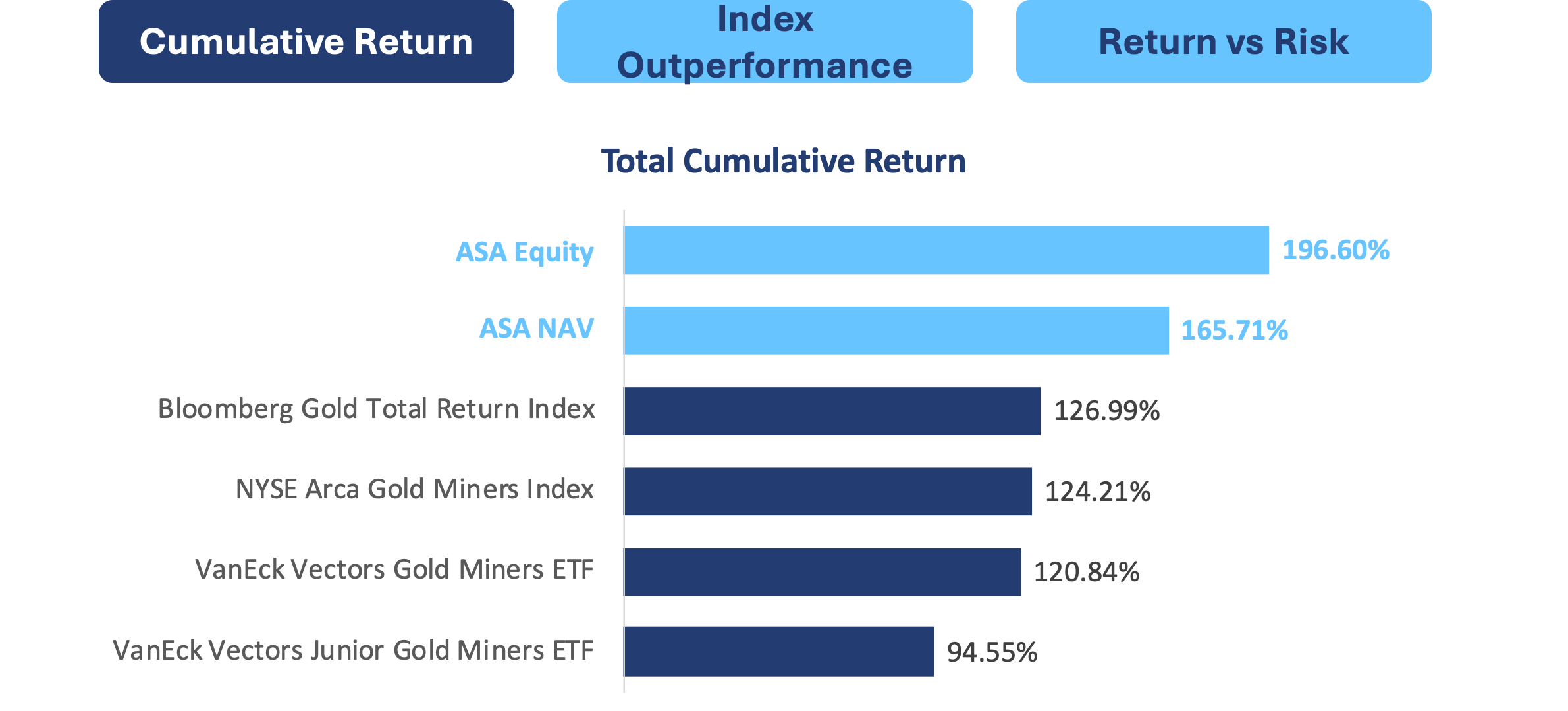 ASA’s risk-adjusted performance has been among the strongest in the industry since Peter Maletis became portfolio manager in April 2019, later joined by Jamie Holman. The Fund has outperformed key benchmarks and most publicly available funds in the precious metals space.