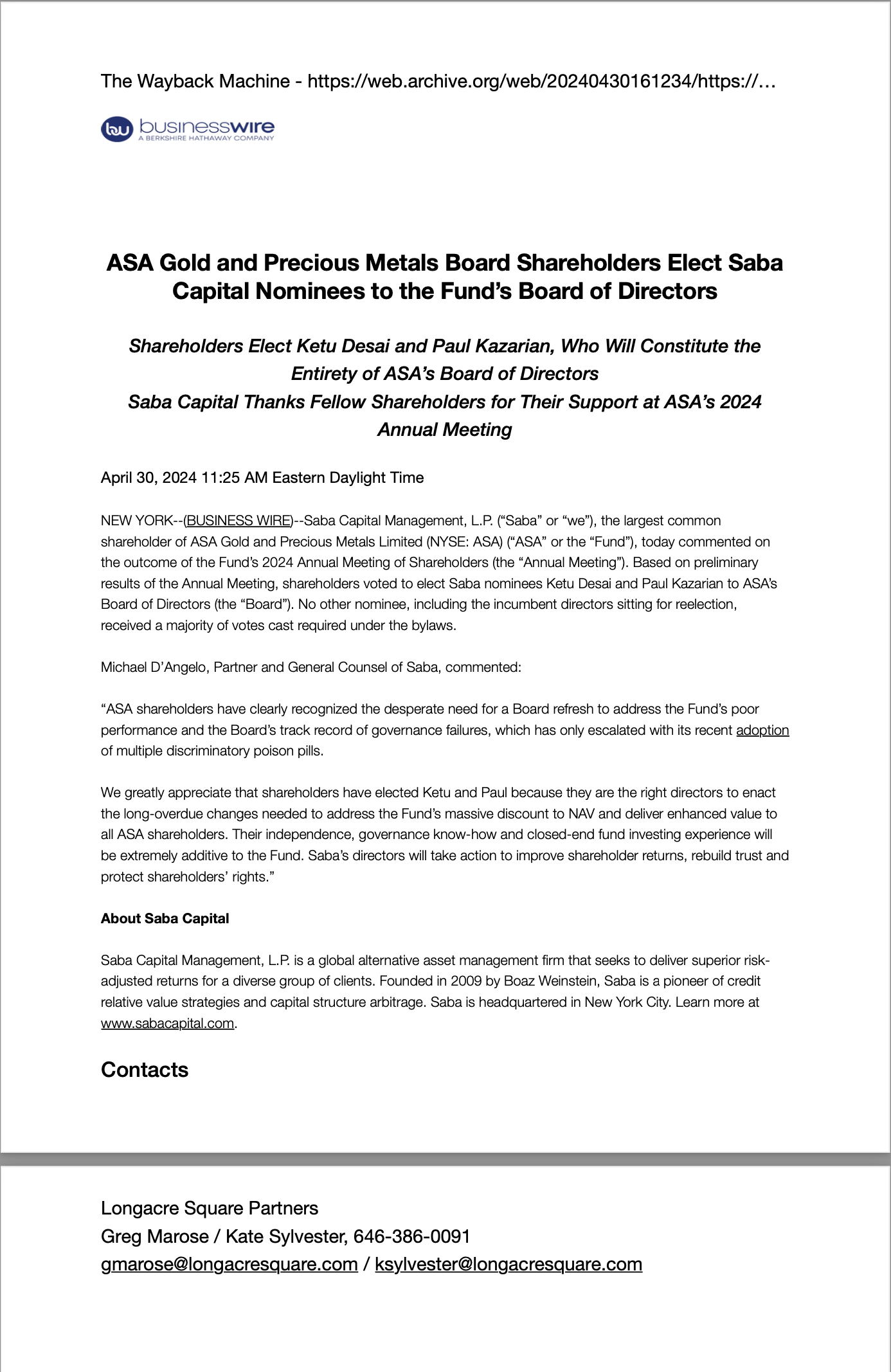 Saba is seeking board control through a special meeting to add a fifth director. Shareholders are encouraged to vote NO to protect ASA’s mandate.