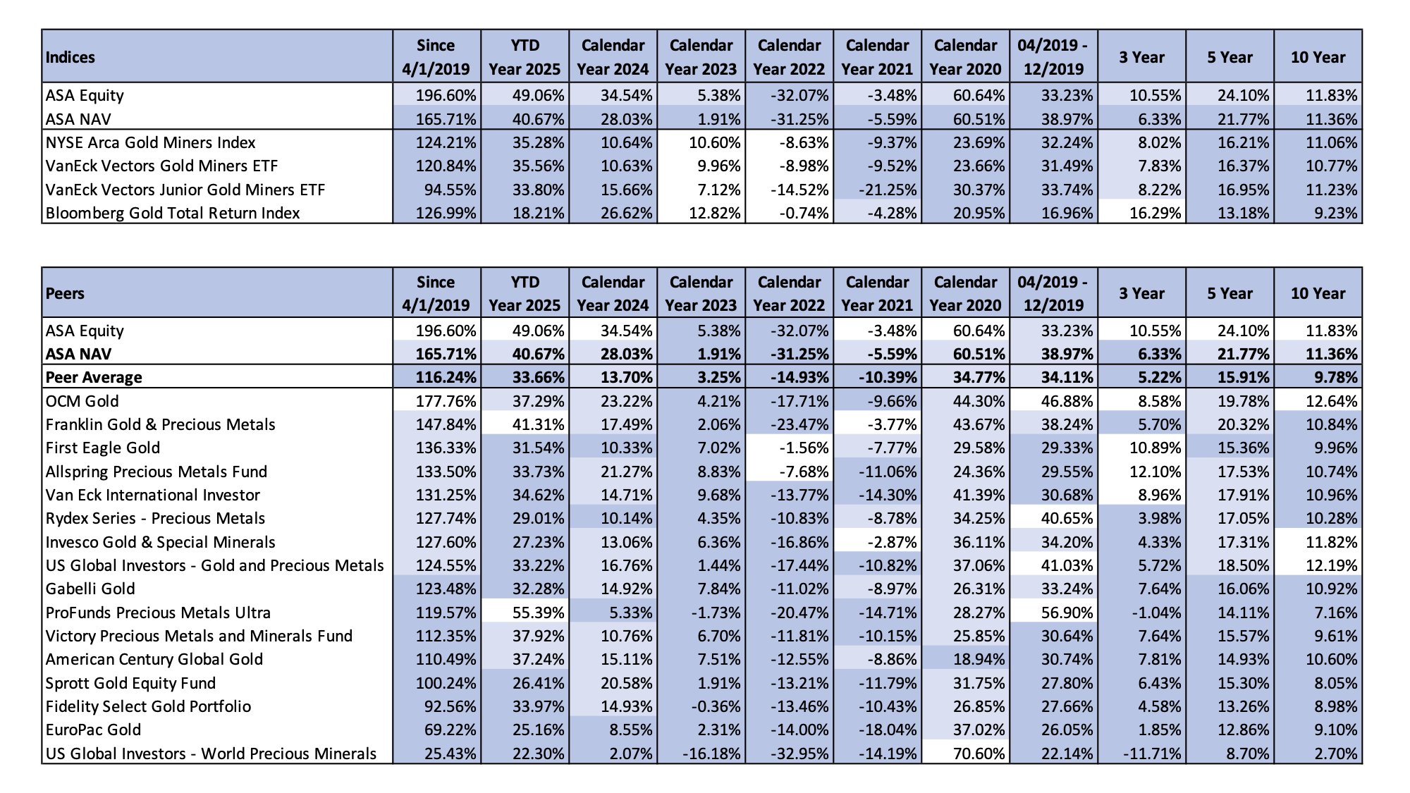 Since April 2019, when Peter Maletis became portfolio manager, ASA has outperformed mining indices, gold, and peer funds across multiple timeframes. The Fund’s approach—focused on disciplined stock selection, long-term positioning, and access to less liquid mining equities—has delivered strong returns even through sector volatility.
